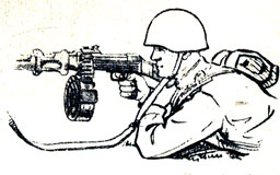 Занимая место для стрельбы из положения лежа, если пулемет в положении "на ремень", наводчик снимает пулемет с плеча, подхватывает его левой рукой за спусковую скобу и ствольную коробку. Затем берет пулемет правой рукой за ствольную накладку и цевье, берет ноги сошки, разводит их. Одновременно с этим делает полный шаг правой (левой) ногой вперед и, наклоняясь вперед, ставит пулемет на сошку в направлении стрельбы. Не разгибаясь, опирается обеими руками о землю, отбрасывает ноги назад и ложится на живот, раскинув ноги в стороны, носками наружу (рис. 80).