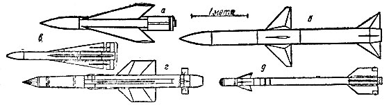 Рис. 18. Управляемые снаряды воздушного боя: а - А. А. 20; б - 'Спэрроу'; в - 'Супер Фолкон'; г - 'Файрстрик'; д - 'Сайдуиидер'